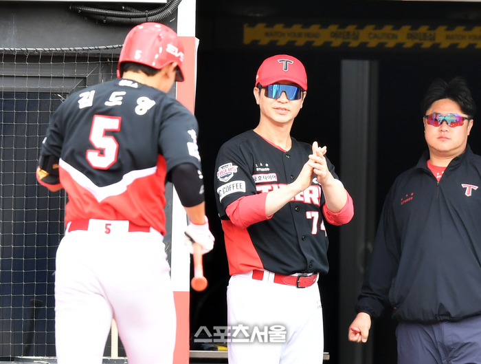 KIA 2번타자 김도영이 4일 수원KT위즈파크에서 열린 2023프로야구 KT위즈와 KIA타이거즈의 경기 더블헤더 1차전 2회초 2사 1루에서 배제성을 상대로 좌월 2점홈런을 터트리고 홈인하고 있다. 박수로 축하하는 김종국 감독. 2023.10.04.
