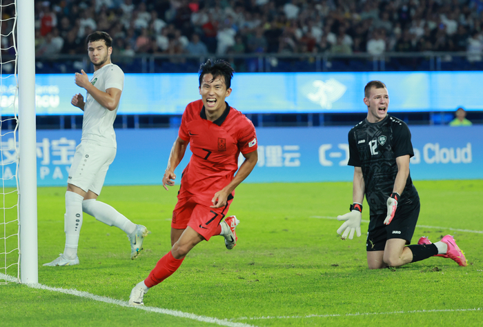 우즈베키스탄전은 황선홍호가 도전하는 대회 ‘3연패’의 최대 고비로 여겨졌다. 우즈베키스탄은 국제축구연맹(FIFA) 랭킹은 75위로 높지 않지만 이 연령대에서 강세를 보인다. 우즈베키스탄은 아시아축구연맹(AFC) 23세 이하(U-23) 아시안컵에서 지난 2018년 우승, 2020년 4위, 지난해 준우승에 오를 정도로 저력이 있다. 5년 전 2018 자카르타·팔렘방 대회 때도 8강에서 만나 연장전 끝에 4-3 진땀승을 거둔 바 있다.
