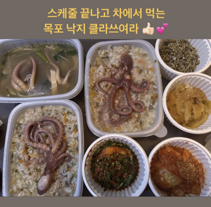 게시물 속에는 먹음직스러운 낙지요리가 다양하게 차려져 있다. 스케줄 후 차에서의 식사이지만 간단하지 않은 푸짐한 한상차림으로 송가인의 먹방 요정다운 면모가 돋보인다.