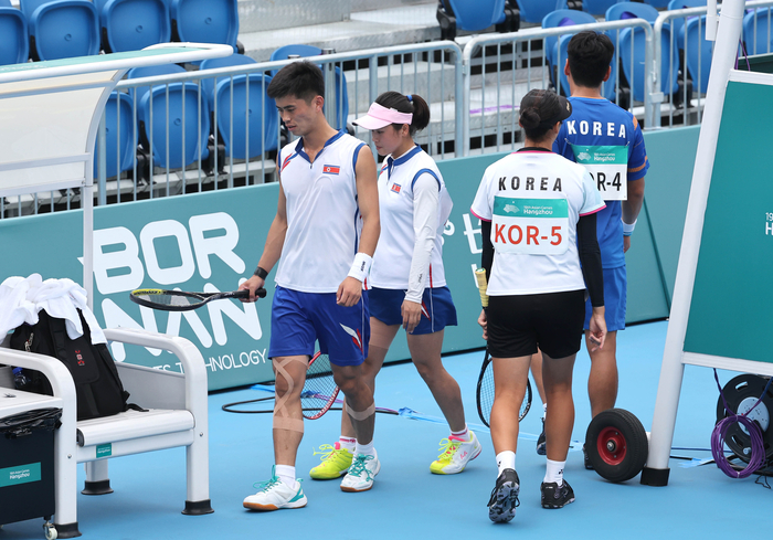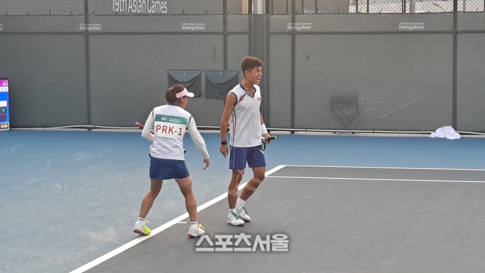5일 오후 중국 저장성 항저우의 올림픽 스포츠센터 테니스코트에서 열린 2022 항저우아시안게임 소프트테니스(정구) 혼합복식 8강전. 휴전선을 사이에 두고 위 아래로 갈린 남북 선수들이 만났다.