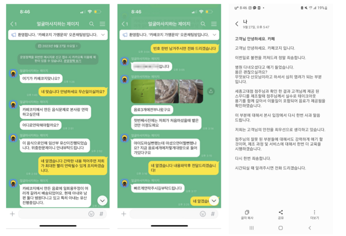 그 후 카페코지 측은 점주로부터 연락을 받았으나, 상황이 나아지는게 전혀 없다는 말만 되풀이 답변만 들었다며, 본인의 잘못에 대해 본사나 타지점에까지 피해를 끼치게 될것 같아 죄송하다는 답변만 받았다고 했다.