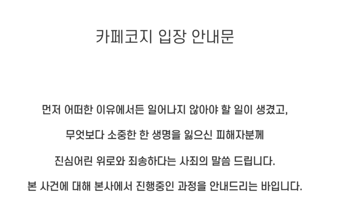 그러나 사건이 공론화 되고 국민들이 분노하자 카페코지는 뒤늦게 입장문을 발표했다. 카페코지 측은 “어떠한 이유에서든 일어나지 않아야 할 일이 생겼고, 무엇보다 소중한 한 생명을 잃으신 피해자분께 진심어린 위로와 죄송하다는 사죄의 말씀 드린다”며 “본 사건에 대해 본사에서 진행중인 과정을 안내드린다”고 운을 뗏다.
