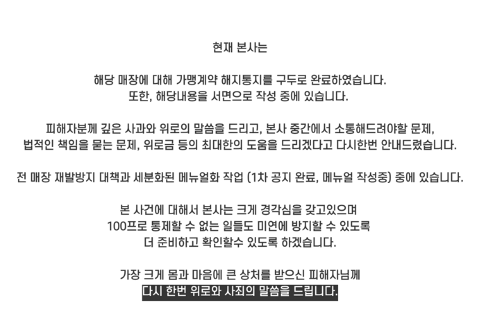 아울러 “가장 크게 몸과 마음에 큰 상처를 받으신 피해자님께 다시 한번 위로와 사죄의 말씀을 드린다”고 말하며 사건 초기 대응과는 다른 태도를 보이고 있다. 앞서 피해자는 본사측이 잠수를 탔다고 주장했다.