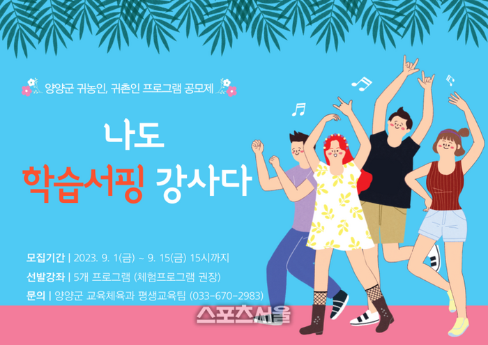 [스포츠서울ㅣ김기원기자] 양양군이 주민들에게 건전한 여가 생활과 문화 충족의 기회를 제공하기 위해, 귀농·귀촌인 강사로 구성된 평생학습 프로그램의 수강생 56명을 10월 5일부터 12일까지 모집한다.