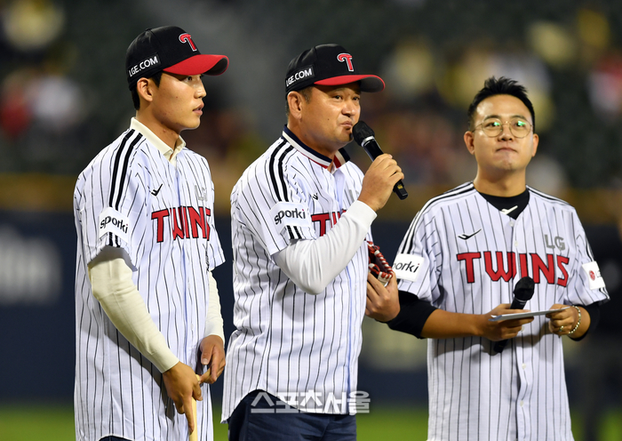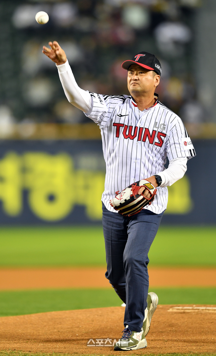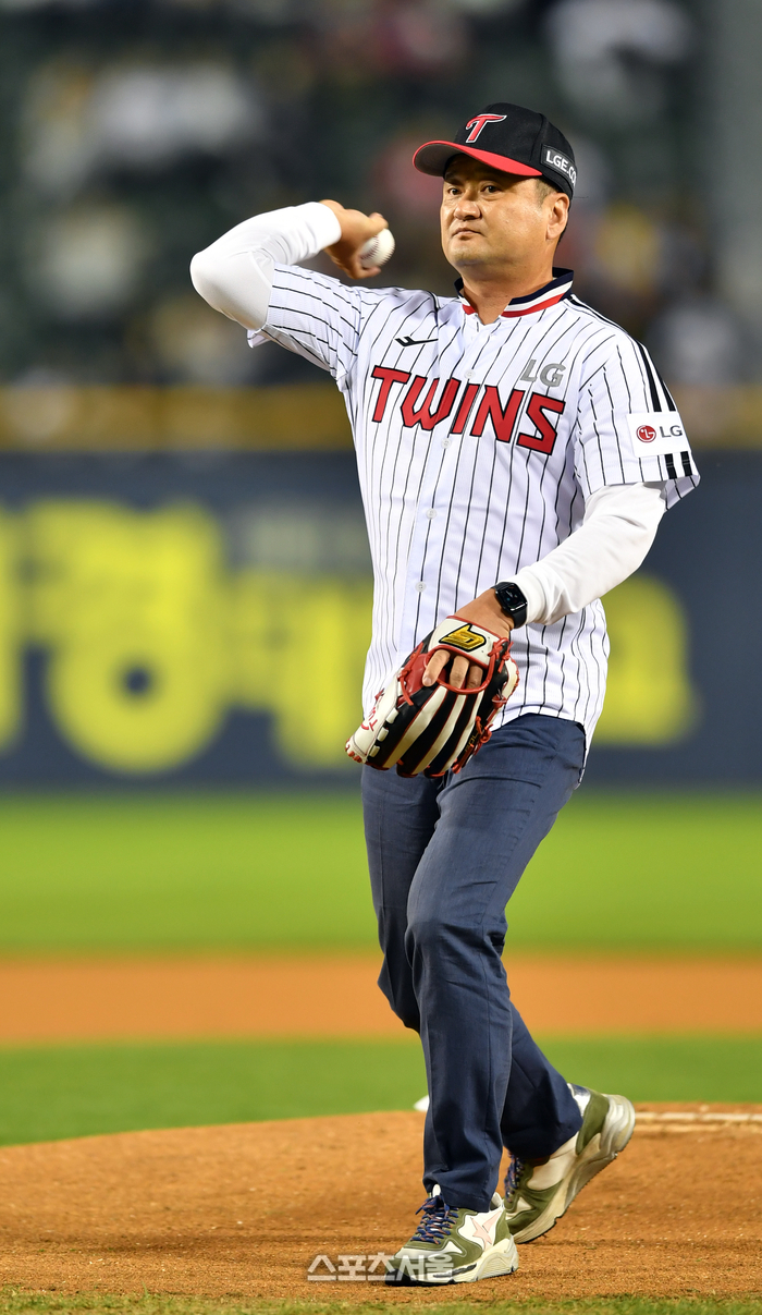 인천고 계기범 감독이 6일 잠실구장에서 열린 2023 프로야구 LG트윈스와 KIA타이거즈의 경기에서 시구를 하고 있다. 시타는 2024년 LG에 지명된 인천고 김현종 선수가 나섰다.2023.10.06.