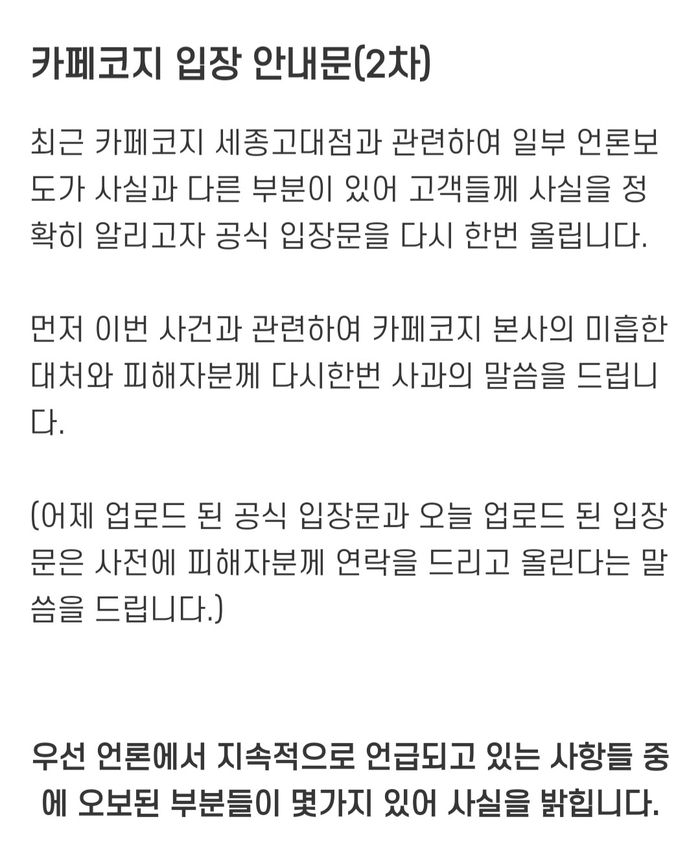 카페코지는 2차 입장 안내문에 “우선 언론에서 지속적으로 언급되고 있는 사항 중에 오보된 부분들이 몇 가지 있어 사실을 밝힌다”며 “이번 사건과 관련하여 카페코지 본사의 미흡한 대처와 피해자분께 다시 한번 사과의 말씀을 드린다”고 말했다.