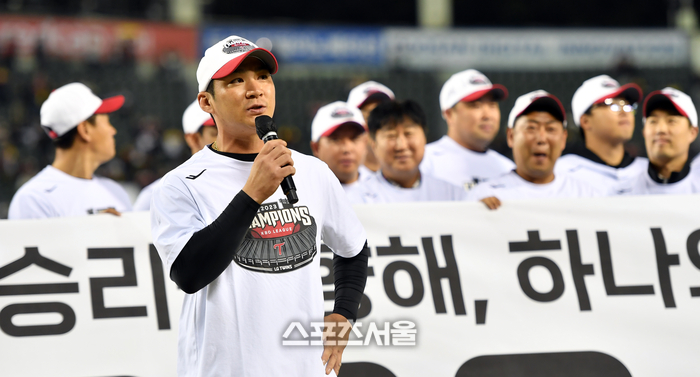염 감독에 이어 주장 오지환도 팬들에게 고마움을 전했다. 메시지를 전하는 중 자신도 모르게 지난 시간이 떠오른 듯 눈시울을 붉혔다. 2009년에 입단한 오지환은 현재 LG 선수 중 가장 오랫동안 핀스트라이프 유니폼을 입고 있다. 정주현, 최동환과 함께 입단해 암흑기 막바지와 2013 암흑기 탈출, 그리고 지난 몇 년 동안 끝내 이루지 못한 정규시즌 1위를 경험했다. 그래서 더 의미가 큰 이날 정규시즌 우승 세리머니였다.