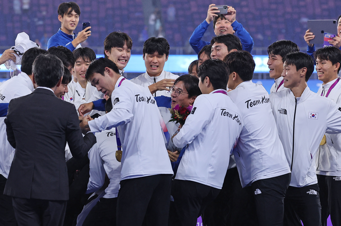 황 감독에게도 중요했던 아시안게임이었다. 황 감독은 포항 스틸러스에서 성공 가도를 달린 뒤 FC서울, 대전하나시티즌에서 이렇다 할 성과를 거두지 못했다. 그렇게 야인 생활 끝에 대표팀을 맡았고, 우승까지 이끌었다. 황 감독은 “계속 진행형이다. 여기서 끝이 아니다. 내일이면 뭔가를 갈망하게 될 것이다. 묵묵히 내 길을 가는 것이 지도자의 의미라고 생각한다. 우승이 주는 건 오늘 하루 뿐이다. 내일부터 올림픽 예선을 준비해야한다”라고 다잡았다.