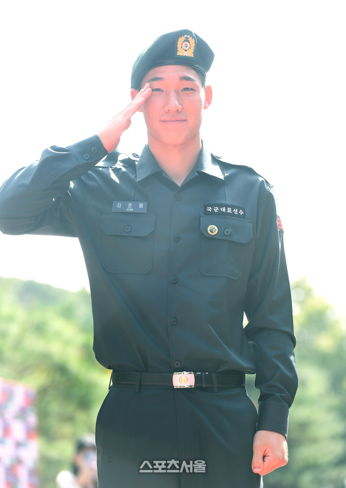 친선경기를 위해 축구국가대표팀에 소집된 김준홍(김천상무)이 9일 오후 파주 축구국가대표트레이닝센터(NFC)에 입장하면서 거수경례를 하고 있다. 2023. 10. 9. 파주 | 박진업기자 upandup@sportsseoul.com