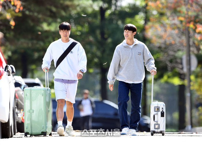 친선경기를 위해 축구국가대표팀에 소집된 김영권(왼쪽)과 이재성이 9일 오후 파주 축구국가대표트레이닝센터(NFC)에 입장하고 있다. 2023. 10. 9. 파주 | 박진업기자 upandup@sportsseoul.com