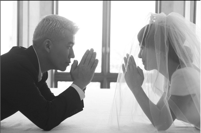 공개한 사진에는 션과 정혜영이 리마인드 웨딩 사진을 찍은 모습이 담겨 눈길을 끌었다.