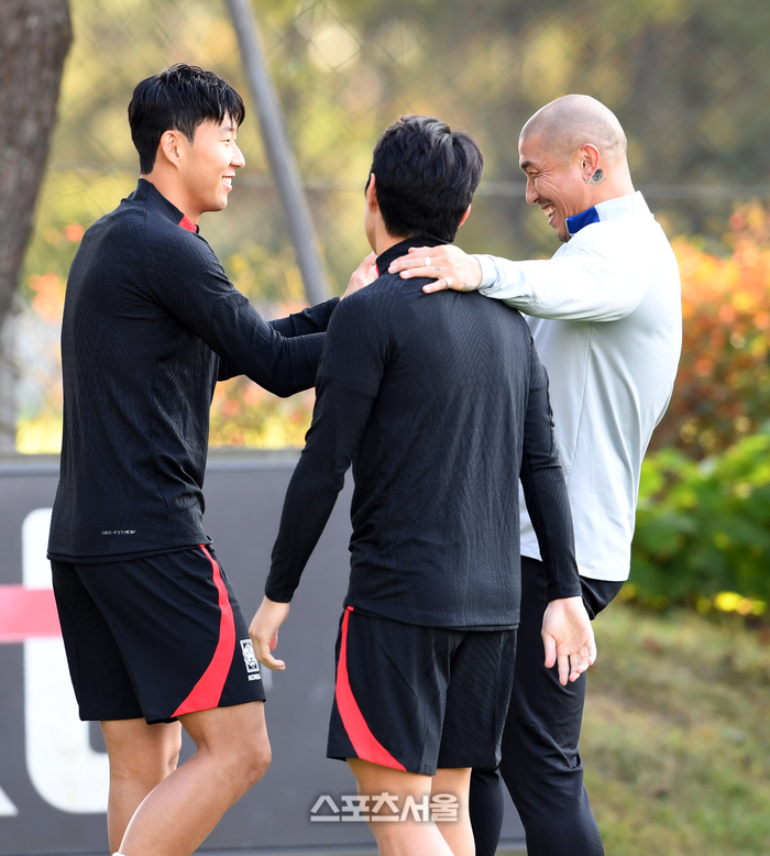 친선경기를 위해 축구국가대표팀에 소집된 손흥민(왼쪽)이 9일 오후 파주 축구국가대표트레이닝센터(NFC)에서 훈련에 앞서 이강인(가운데)-차두리 코치와 인사를 하고 있다. 2023. 10. 9. 파주 | 박진업기자 upandup@sportsseoul.com