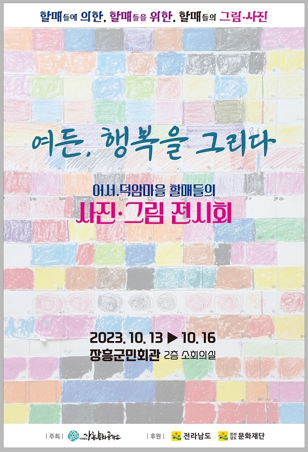 [스포츠서울│조광태기자] 전남 장흥군 (사)장흥문화공작소는 10월 13일부터 16일까지 장흥 군민회관 2층 소회의실에서 장흥군 용산면 덕암, 어서마을 할머니들의 사진과 그림 전시회를 연다고 전했다.