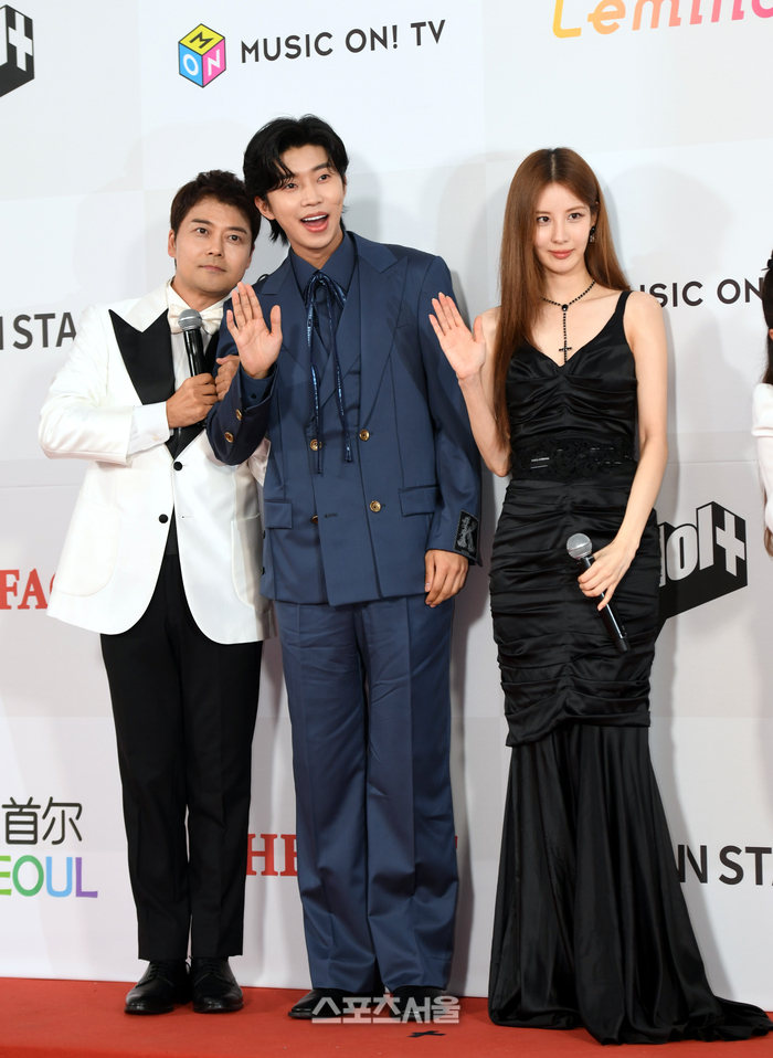 전현무, 임영웅, 서현이 10일 인천 남동체육관에서 열린 '2023 더팩트 뮤직 어워즈' 레드카펫 행사에서 포즈를 취하고 있다. 2023. 10. 10. 인천 | 최승섭기자 thunder@sportsseoul.com