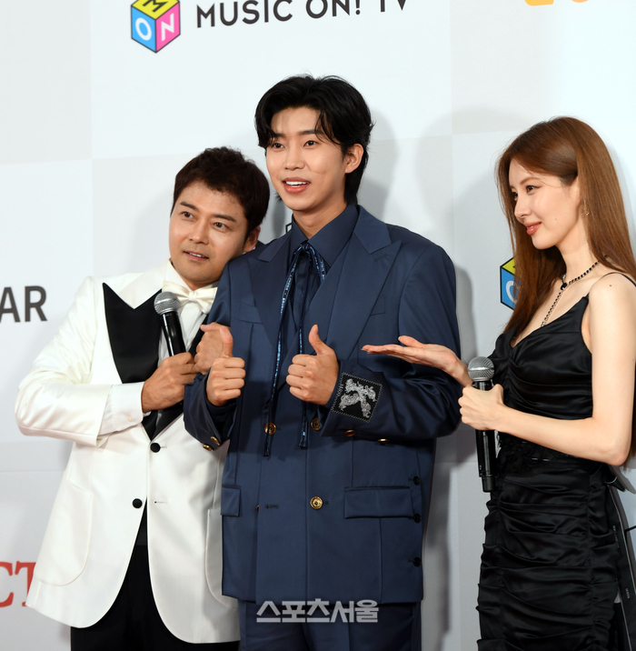 전현무, 임영웅, 서현이 10일 인천 남동체육관에서 열린 '2023 더팩트 뮤직 어워즈' 레드카펫 행사에서 포즈를 취하고 있다. 2023. 10. 10. 인천 | 최승섭기자 thunder@sportsseoul.com