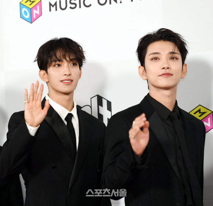 세븐틴 도겸(왼쪽) 조슈아가 10일 인천 남동체육관에서 열린 '2023 더팩트 뮤직 어워즈' 레드카펫 행사에서 포즈를 취하고 있다. 2023. 10. 10. 인천 | 최승섭기자 thunder@sportsseoul.com