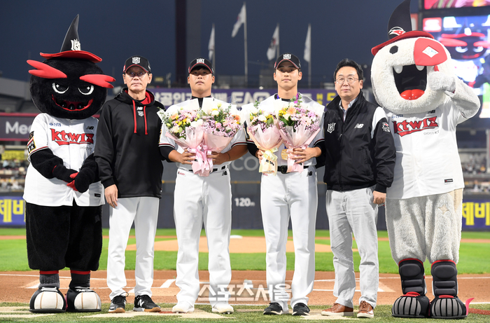 아시안게임에서 금메달을 딴 KT 위즈 강백호(왼쪽 둘째)와 박영현(왼쪽 셋째)이 10일 수원 KT 위즈 파크에서 열린 2023 KBO리그 두산 베어스와 경기에 앞서 이강철 감독(맨 왼쪽)과 나도현 단장으로부터 축하 꽃다발을 받고 기념촬영을 하고 있다. 2023. 10. 10. 수원 | 박진업기자 upandup@sportsseoul.com