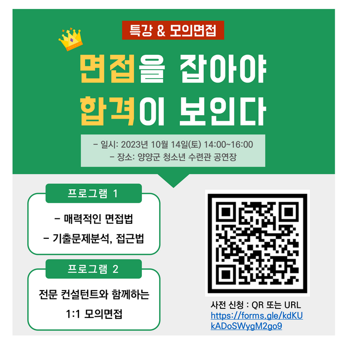 양양군 관계자는 “미래의 주역인 지역 학생들이 다양한 입시제도와 변화하는 대입전략에 대응할 수 있도록 입시면접 특강을 진행하는 만큼, 많은 학생들이 참석하여 효율적인 입시전략을 세우는 데 도움이 되길 바란다.”고 말했다.