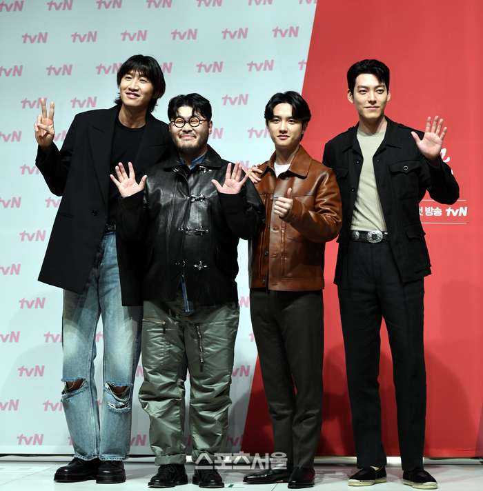 이광수, 김기방, 도경수, 김우빈(왼쪽부터)이 11일 서울 강남구 엘리에나호텔에서 열린 tvN ‘콩 심은 데 콩 나고 팥 심은 데 팥 난다’ 제작발표회에서 포토타임을 갖고 있다. '콩 심은 데 콩 나고 팥 심은 데 팥 난다'는 친한 친구들끼리 작은 밭을 일구게 됐을 때 벌어지는 재미난 일들을 유쾌한 다큐 형식으로 풀어낸 프로그램이다. 2023. 10. 11. 최승섭기자 thunder@sportsseoul.com