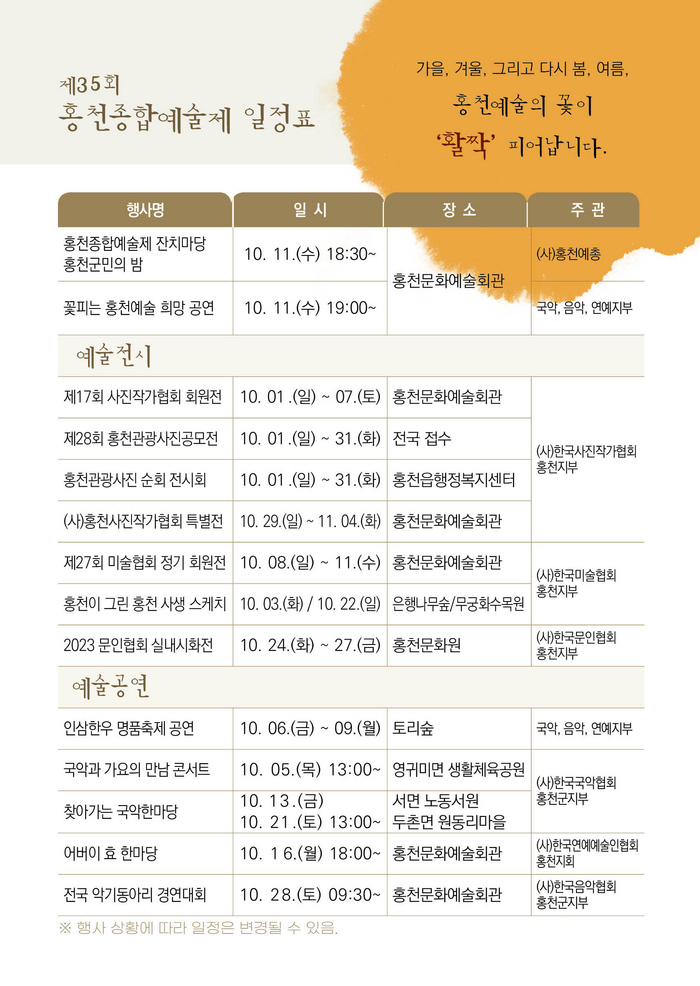 이번 종합예술제는 ‘가을에 꽃 피우는 홍천예술’을 주제로 국악, 음악, 사진, 연예 등 지역 전문 문화예술이 총망라된 다양한 공연과 전시가 이어진다.