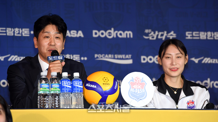 한국도로공사 김종민 감독(왼쪽)과 배유나가12일 서울 강남구 리베라호텔에서 진행된 도드람 2023-2024 V-리그 여자부 미디어데이 행사에서 시즌 각오를 밝히고 있다. 2023. 10. 12. 박진업기자 upandup@sportsseoul.com