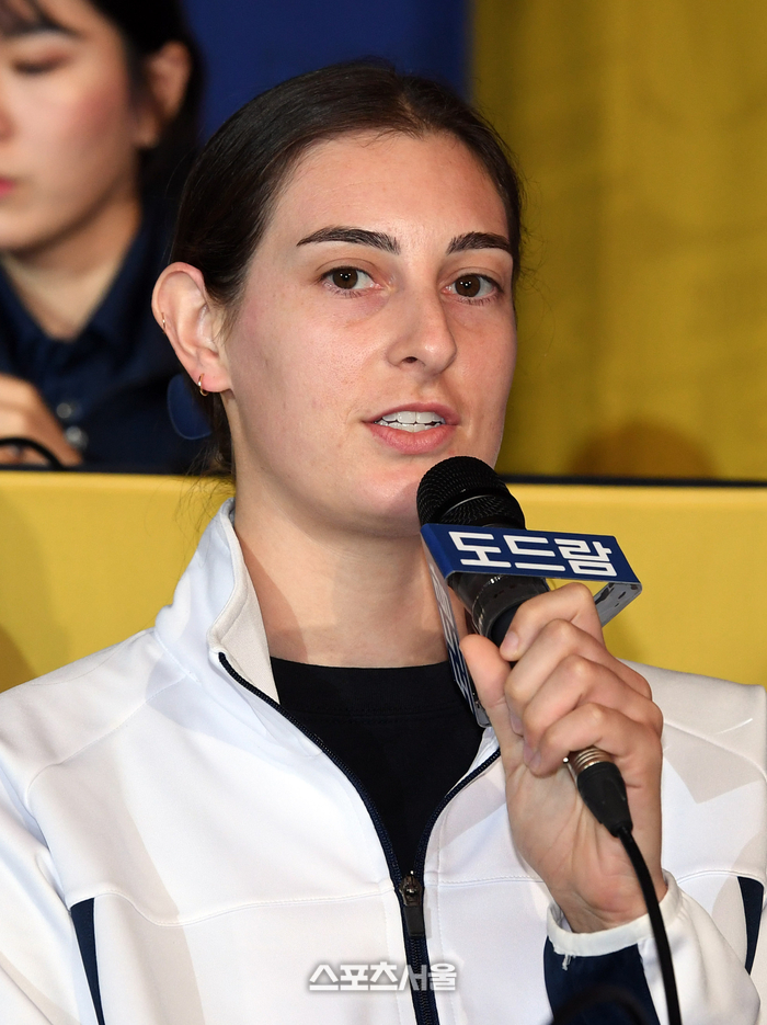 IBK기업은행 아베크롬비가 12일 서울 강남구 리베라호텔에서 진행된 도드람 2023-2024 V-리그 여자부 미디어데이 행사에서 사회자의 질문에 답을 하고 있다. 2023. 10. 12. 박진업기자 upandup@sportsseoul.com