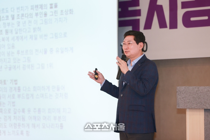이어 이 시장은 레오나르도 다빈치의 작품 ‘살바토르 문디’를 소개하며 특강을 시작했다. ‘남자 모나리자’로 평가받는 이 작품에 대해 이 시장은 경매에서 사우디아라바이아의 ‘무함마드 빈살만’ 왕세자에게 약 4억 5000만달러(현재 환율로 한화 약 6000억원)에 낙찰되면서 세계에서 가장 높은 가격으로 거래된 그림으로 기록됐다고 설명했다.
