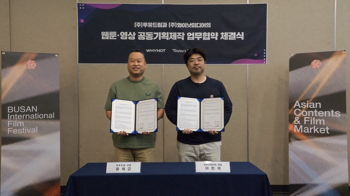 지난 7일 ‘2023 아시아콘텐츠&필름마켓(ACFM) 부산스토리마켓’에서 열린 업무협약 체결식에는 투유드림 유택근 대표와 와이낫미디어 이민석 대표를 비롯한 양사 관계자가 참석했다.
