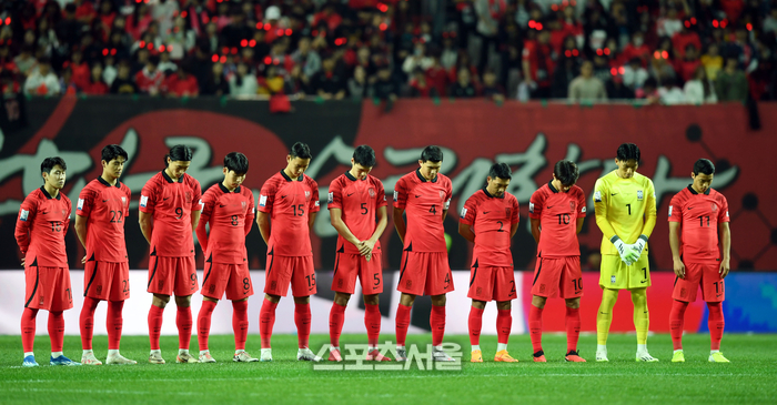 선수들이 13일 서울월드컵경기장에서 열린 축구 국가대표 평가전 튀니지와 경기에 앞서 故 박종환 감독을 추모하며 묵념을 하고 있다. 2023. 10. 13. 상암 | 최승섭기자 thunder@sportsseoul.com