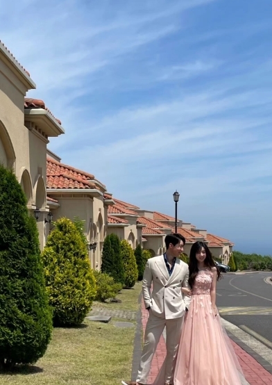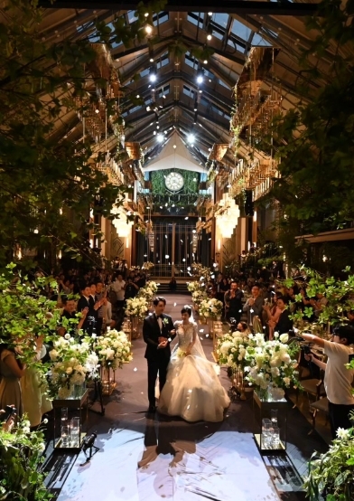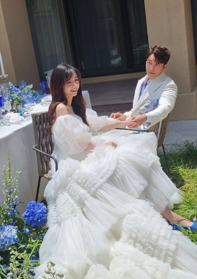 네이비색 턱시도와 원피스를 입은 부부는 선남선녀 비주얼로 눈길을 끌었다. 결혼식장 사진에는 부부의 결혼을 축하하는 지인들의 박수가 더해졌다.