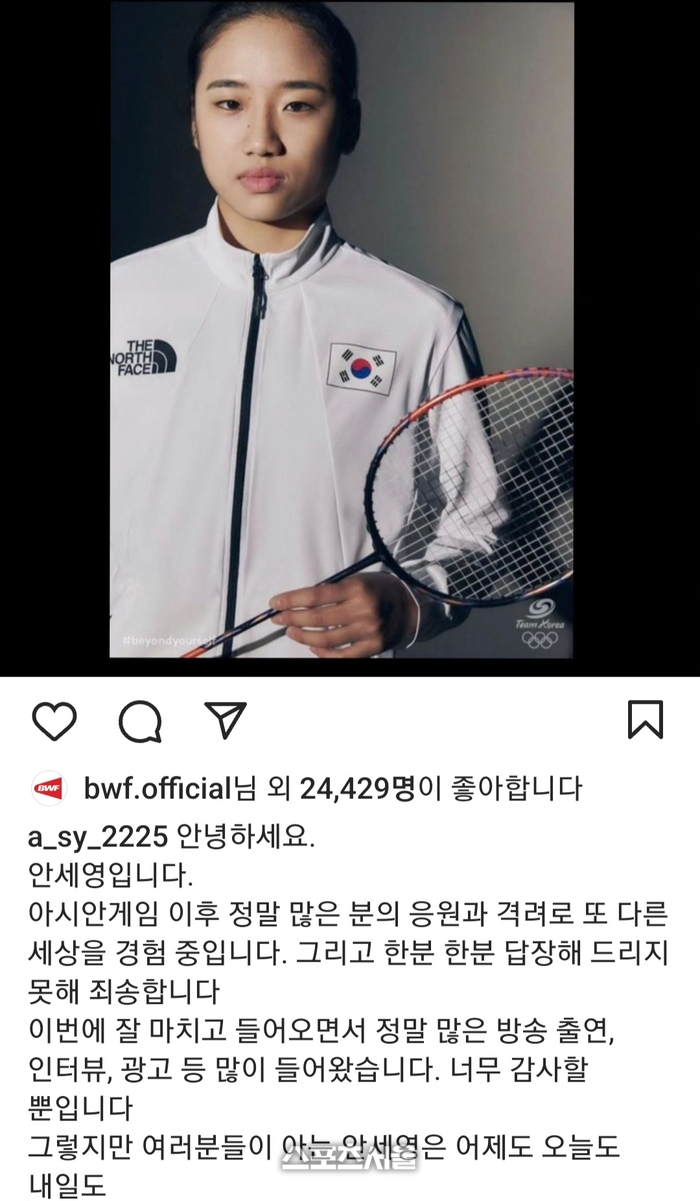 안세영은 지난 13일 자신의 인스타그램(a_sy_2225)를 통해 “아시안게임 이후 정말 많은 분들의 응원과 격려로 또 다른 세상을 경험 중입니다. 한분 한분 답장해 드리지 못해 죄송합니다”며 “이번에 잘 마치고 들어오면서 정말 많은 방송 출연, 인터뷰, 광고 등이 들어왔습니다. 너무 감사할 뿐입니다”고 밝혔다.
