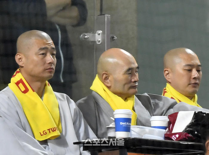 LG 염경엽 감독 멘토로 알려진 호산스님(가운데)이 14일 잠실구장에서 열린 2023프로야구 LG트윈스와 두산베어스의 경기를 찾아 LG 머플러를 두르고 관전해 눈길을 끌고 있다. 2023.10.14.
