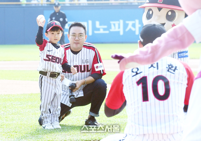 LG 트윈스 오지환의 아들 오세현 군이 15일 잠실구장에서 열린 LG 트윈스와 두산 베어스의 경기에 앞서 시구를 하고 있다. 시포는 LG 오지환이 맡았다. 2023. 10. 15. 잠실 | 박진업기자 upandup@sportsseoul.com