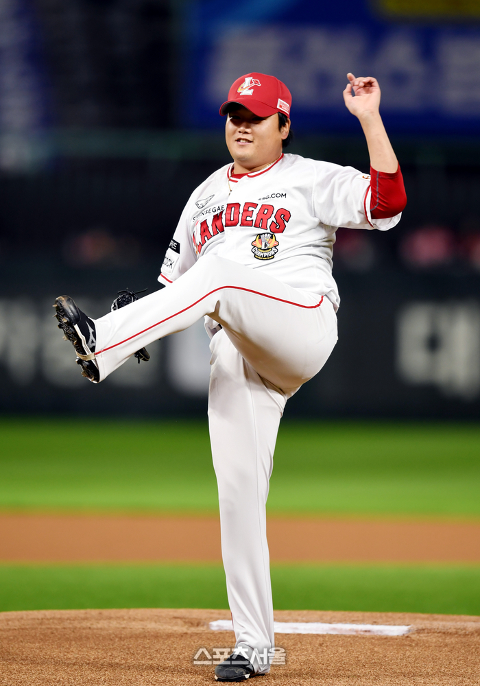 은퇴식을 앞둔 SSG 김태훈이 17일 인천 SSG랜더스필드에서 열린 2023 KBO리그 두산과 경기에 앞서 시구를 하고 있다. 2023. 10. 17. 문학 | 최승섭기자 thunder@sportsseoul.com