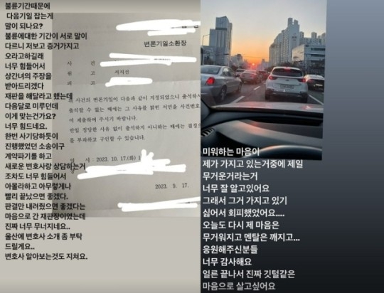 이어 “한 번 사기 당하듯이 진행했었던 소송이고 계약 파기를 하고 새로운 변호사랑 상담하는 거 조차도 너무 힘들어서 아무렇게나 빨리 끝났으면 좋겠다. 판결만 내려줬으면 좋겠다는 마음으로 간 재판장이었는데 진짜 너무 무너진다. 울산에 변호사 소개 좀 부탁드린다”고 토로했다.