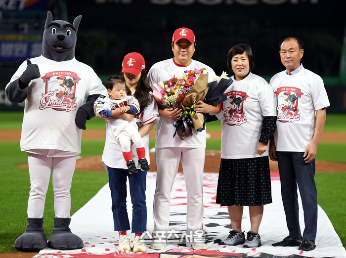 SSG 김태훈이 17일 인천 SSG랜더스필드에서 열린 2023 KBO리그 두산과 경기 후 열린 은퇴식에서 가족들과 기념촬영을 하고 있다. 2023. 10. 17. 문학 | 최승섭기자 thunder@sportsseoul.com