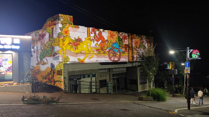 [스포츠서울ㅣ김기원기자] 한국 근대 서양화의 거목이자 한국인이 가장 사랑하는 화가 이중섭(1916~1956) 작품이 프레임을 벗어나, 서귀포시 문화예술의 상징 공간인 서귀포관광극장 벽면에서 아름다운 빛과 함께 이중섭거리의 밤을 수놓고 있다.
