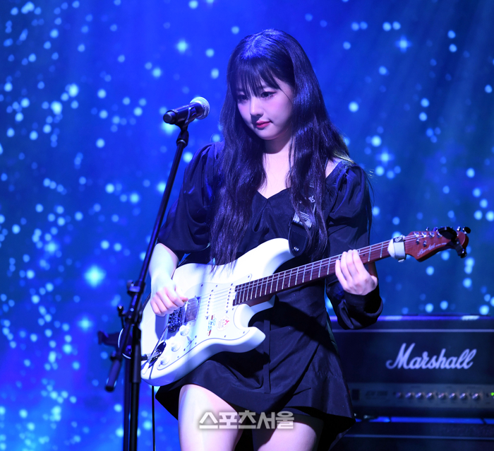 걸밴드 QWER(큐더블유이알) 히나가 18일 서울 마포 무신사 개러지에서 열린 싱글 1집 ‘Harmony from Discord’(하모니 프롬 디스코드) 발매 기념 미디어 쇼케이스에서 수록곡 '별의 하모니' 공연을 하고 있다. 2023. 10. 18. 최승섭기자 thunder@sportsseoul.com