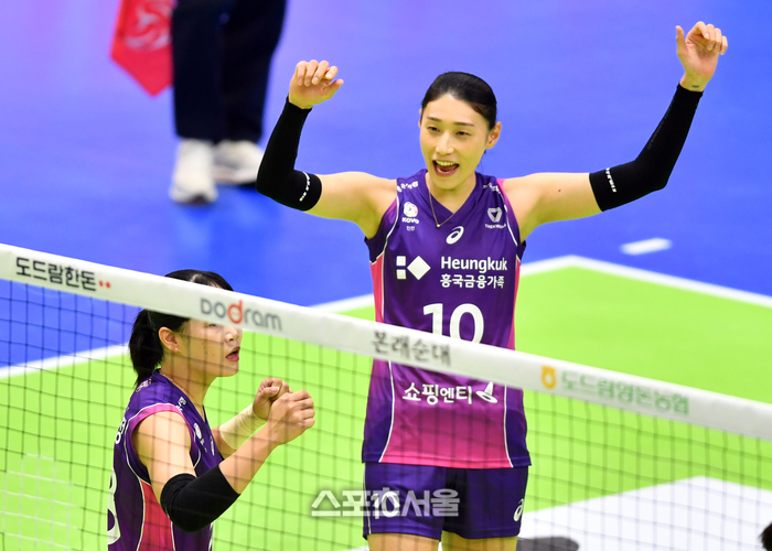 흥국 김연경이 18일 수원실내체육관에서 열린 2023-2024 프로배구 흥국생명과 현대건설의 경기에서 선수들을 독려하며 분위기를 돋우고 있다. .2023.10.18.
