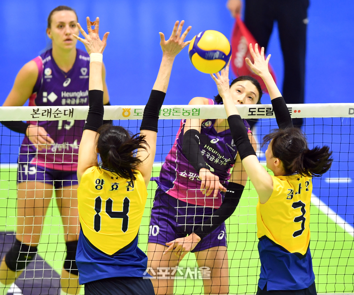 흥국생명 김연경이 18일 수원실내체육관에서 열린 2023-2024 프로배구 흥국생명과 현대건설의 경기에서 현대 이중블로킹을 향해 강타를 시도하고 있다. .2023.10.18.