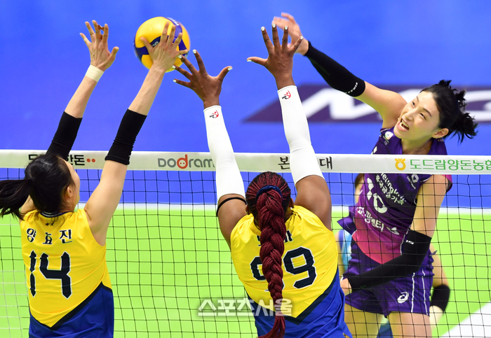 현대건설 김연경이 18일 수원실내체육관에서 열린 2023-2024 프로배구 흥국생명과 현대건설의 경기에서 현대 이중블로킹에 강타를 터트리고 있다. .2023.10.18.