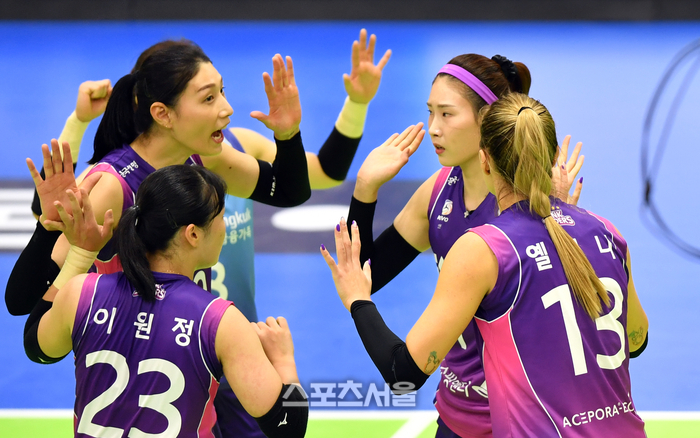흥국생명 김연경이 18일 수원실내체육관에서 열린 2023-2024 프로배구 흥국생명과 현대건설의 경기에서 친구 김수지와 득점 후 기쁨을 나누고 있다. .2023.10.18.