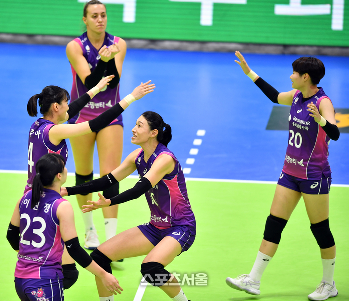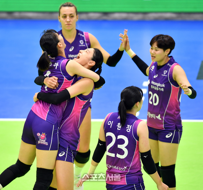 흥국 김연경이 18일 수원실내체육관에서 열린 2023-2024 프로배구 흥국생명과 현대건설의 경기에서 5세트 승부에서 막판 득점을 따낸 이주아를 안아주며 자축하고 있다. .2023.10.18.