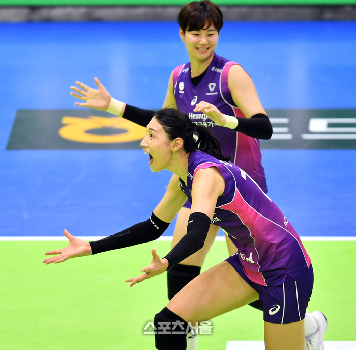 흥국 김연경이 18일 수원실내체육관에서 열린 2023-2024 프로배구 흥국생명과 현대건설의 경기에서 5세트 승부에서 막판 득점을 따낸 이주아를 안아주며 자축하고 있다. .2023.10.18.