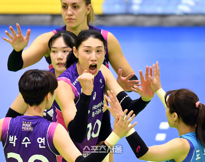흥국 김연경이 18일 수원실내체육관에서 열린 2023-2024 프로배구 흥국생명과 현대건설의 경기에서 5세트 승부에서 막판 득점을 따낸 선수들과 자축하고 있다. .2023.10.18.