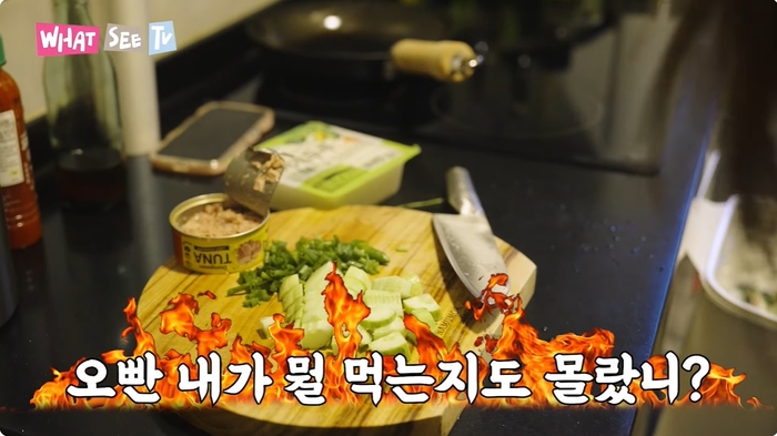 윤혜진은 부기 케어 이후 참치두부비빔밥 레시피도 공개했다. 오이, 쪽파, 두부, 캔참치, 스리라차 소스, 참기름 등을 넣고 요리를 시작했다.