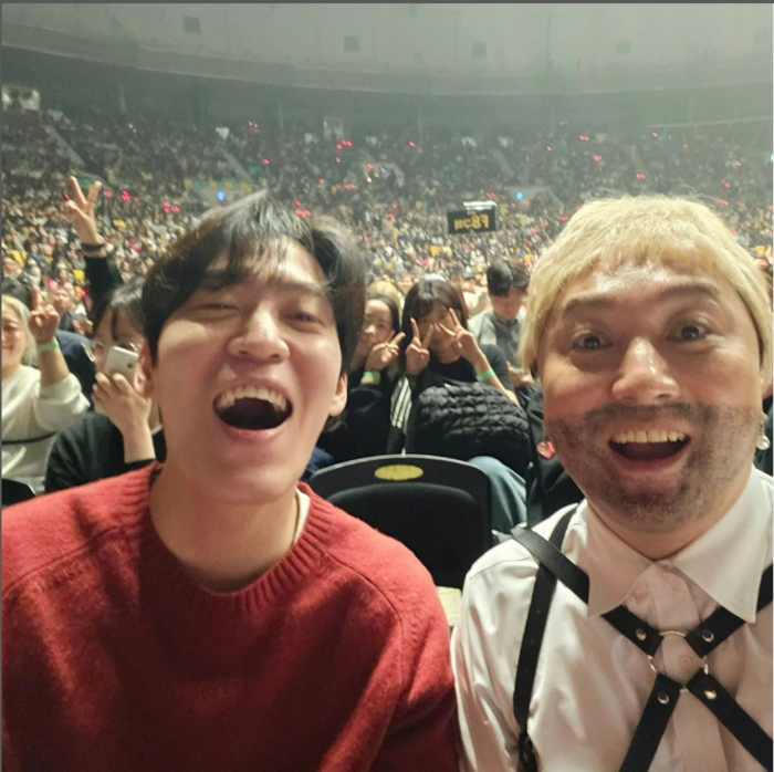 황제성은 가수 존박과 함께 콘서트 현장에서 인증샷을 찍었다. 두 사람의 뒷좌석에 앉은 관객들까지 포즈를 취해 눈길을 끈다.