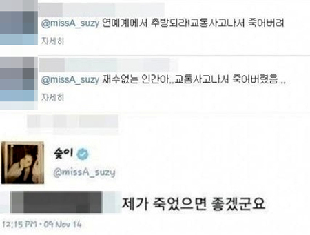 9일 수지는 자신의 트위터에 악플을 남기는 악플러에게 '제가 죽었으면 좋겠군요'라는 답변을 보내 보는 이들을 안타깝게 했다. 수지의 답변을 받은 악플러는 지속적으로 수지에게 악의적인 메시지를 보내왔던 것으로 밝혀졌다.