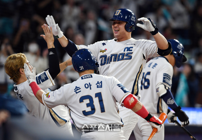NC 다이노스 김형준(오른쪽)이 19일 창원 NC파크에서 열리는 두산 베어스와 와일드카드 결정전 1차전 4회말 2사 두산 선발 곽빈을 상대로 솔로 홈런을 친 뒤 박민우-손아섭과 하이파이브를 하며 기뻐하고 있다. 2023. 10. 19. 창원 | 박진업기자 upandup@sportsseoul.com
