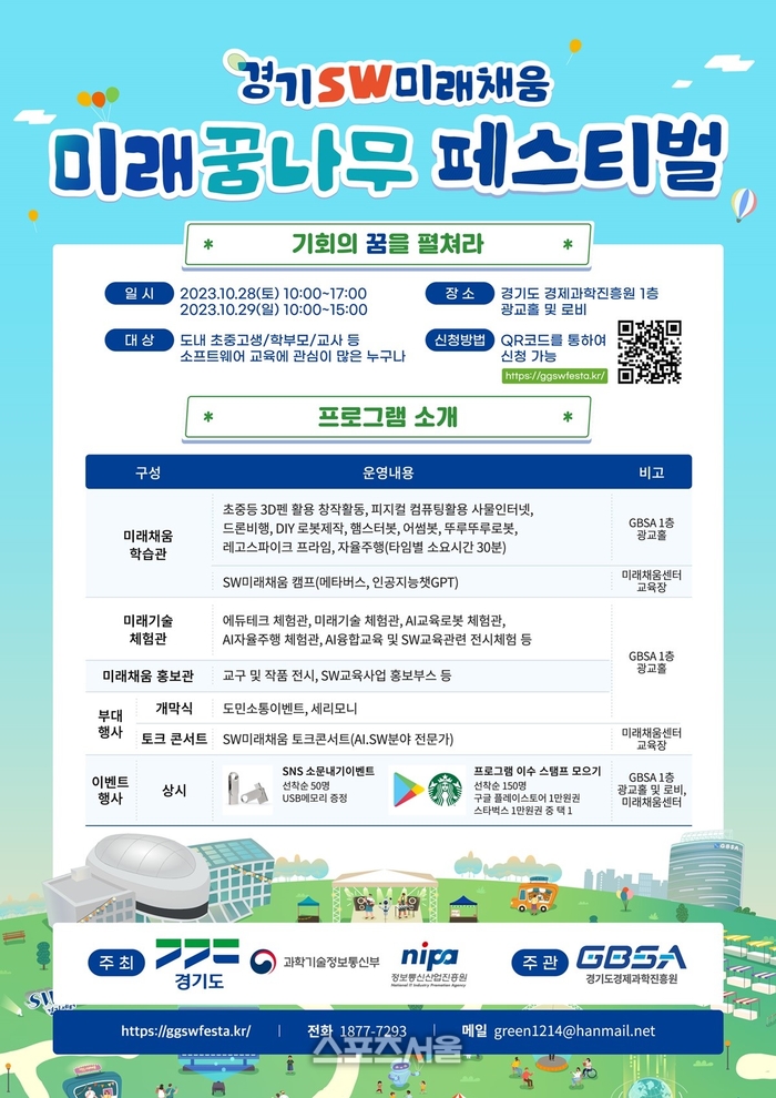 〔스포츠서울│수원=좌승훈기자〕경기도는 ‘미래의 꿈나무, 기회의 꿈을 펼쳐라’를 주제로 2023 경기소프트웨어(SW) 미래채움 페스티벌을 오는 28일과 29일 양일간 연다고 20일 밝혔다.